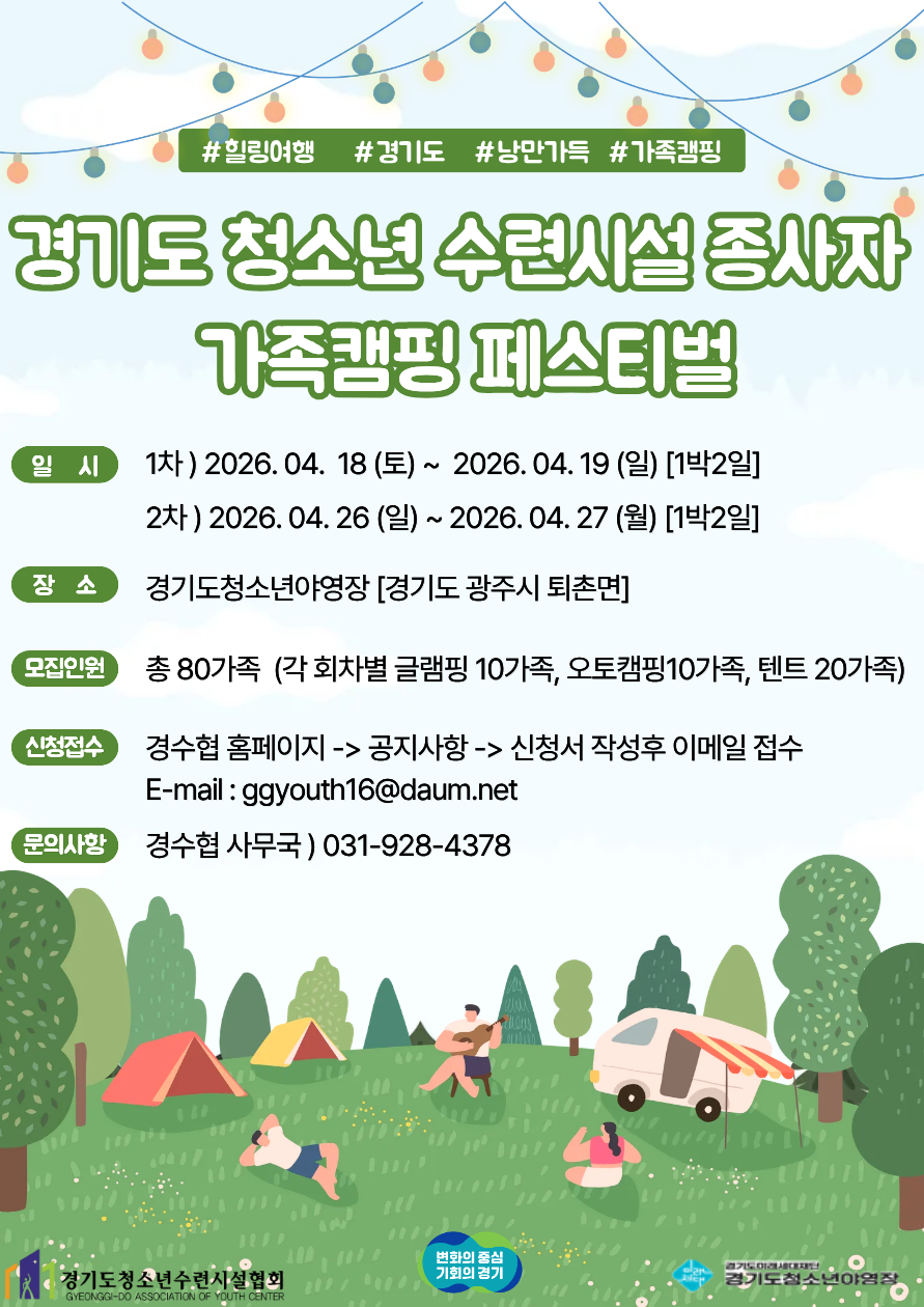 - 공지사항2026 경기도청소년수련시설 가족캠핑페스티벌 참가자 모집 안내 (증빙자료 필수 제출)2026-03-17