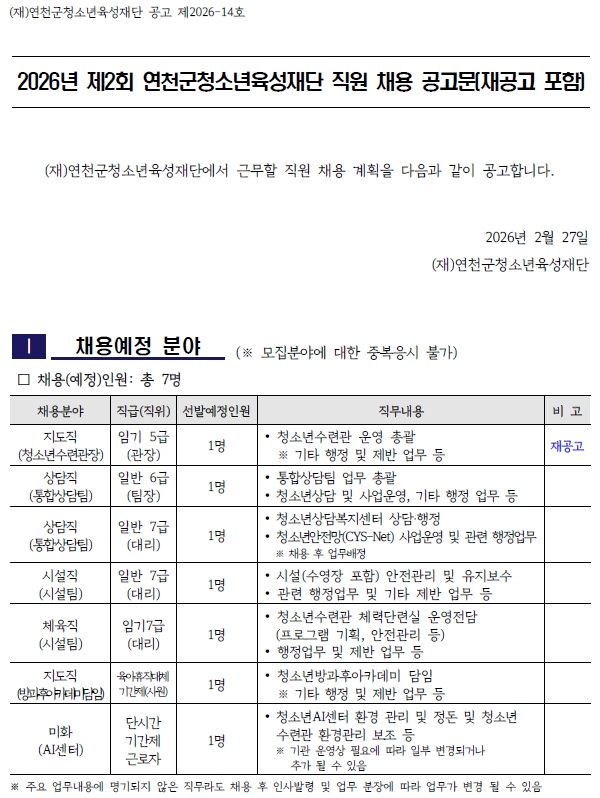 2026년 제2회 연천군청소년육성재단 직원 채용 공고문(재공고 포함)